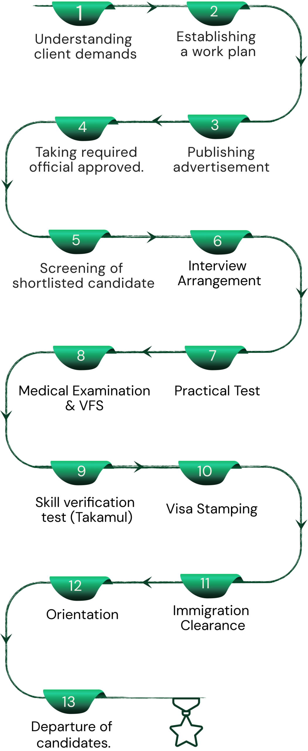 Efficiency meets compliance. We adhere to a strict, transparent workflow that bridges the gap between client requirements and candidate readiness. By systematically managing every stage—including government approvals and immigration clearance—we guarantee a smooth and timely deployment of talent.